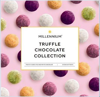 Zmes plnených praliniek: pralinky z tmavej čokolády s náplňou „black truffle“; pralinky z bielej čokolády s náplňou „black truffle“ s čerešňovou príchuťou; pralinky z bielej čokolády s krémovou náplňou s príchuťou ríbezlí; pralinky z bielej čokolády s náplňou s pomarančovou príchuťou; pralinky z tmavej čokolády s krémovou náplňou s bazalkovo-jahodovou príchuťou.