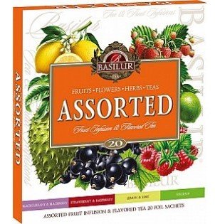 BASILUR Assorted Fruit & Flavoured Tea zmes ovocných, čierných a zelených porciovaných čajov s kúskami rastlín a ovocia.