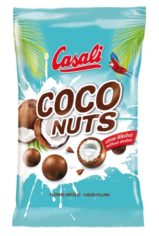 Mliečne guličky s kokosovou náplňou bez alkoholu, zahalené do závoja z chrumkavej mliečnej čokolády, tekutou kokosovou náplňou bez alkoholu s kakaom z vlastnej pražiarne.