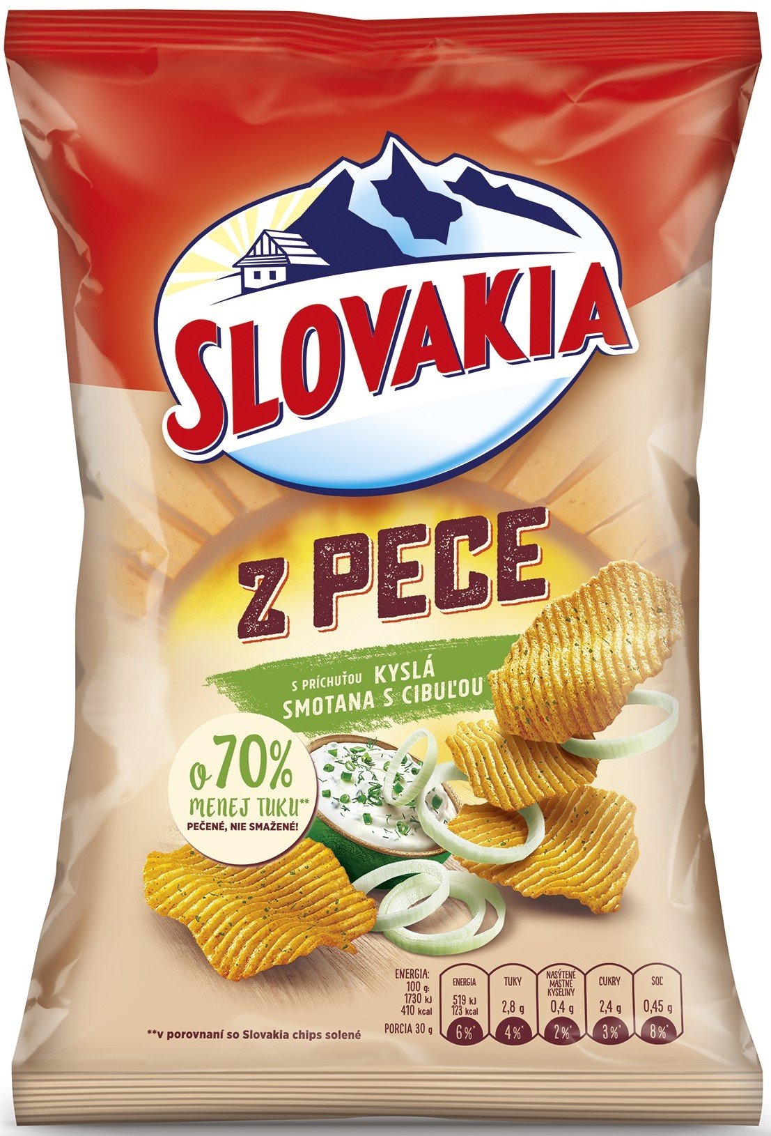 Užite si lahodnú chuť obľúbených lupienkov s až o 70% menej tuku! Zemiakové lupienky Slovakia Z PECE s príchuťou Kyslá smotana s cibuľou sú ideálnou voľbou pre všetkých, ktorí milujú chrumkavé maškrtenie, ale zároveň si strážia svoj príjem tuku. Tieto lupienky sú pečené, nie smažené, vďaka čomu obsahujú výrazne menej tuku v porovnaní s tradičnými solenými lupienkami Slovakia. Každý lupienok je vlnkovaný pre extra chrumkavosť a bohato ochutený populárnou kombináciou kyslej smotany a jemnej cibuľky, ktorá dodáva nezameniteľnú, jemne pikantnú a krémovú chuť. Perfektné na párty, k filmu alebo ako rýchly snack kedykoľvek počas dňa.Zloženie: