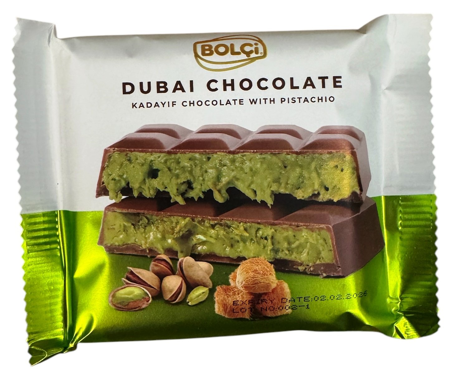 Jedinečná pochúťka z Dubaja: 100-gramová dubajská čokoláda je zušľachtená pistáciami a kadayifom a prináša exkluzívnu chuť Orientu priamo k vám domov. Ideálna na ochutnávku alebo pečenie originálneho dezertu s arabskou príchuťou.Zloženie: