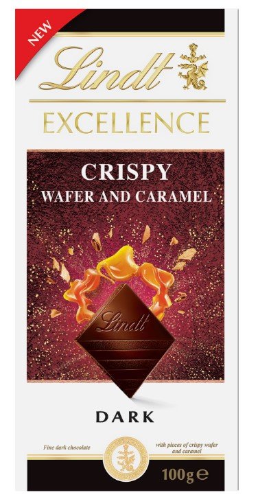 Horká čokoláda s kúskami chrumkavej sušienky (8%) a karamelu (3%).Zloženie: