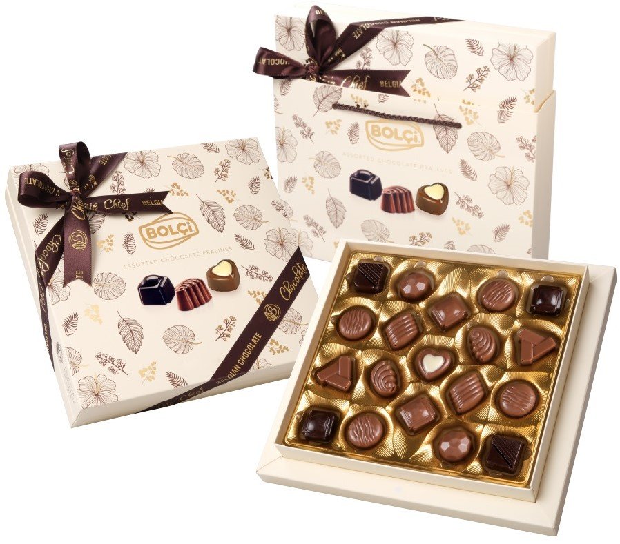 Luxusná darčeková bonboniéra Bolci – Belgian Chocolate Pralines prináša výber jemných belgických čokoládových pralín s rôznymi náplňami a tvarmi. Každá pralina je vyrobená z kvalitnej mliečnej, horkej a bielej čokolády a ponúka harmonickú kombináciu krémových, orieškových a kakaových tónov. Elegantné balenie so saténovou stuhou robí z tejto bonboniéry ideálny darček na výnimočné príležitosti – sviatky, oslavy, poďakovanie alebo ako prémiovú sladkú pozornosť.Zloženie:
