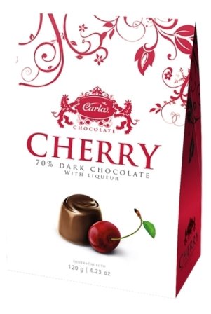 Formované bonbńy v horkej čokoláde s višňou v alkohole.