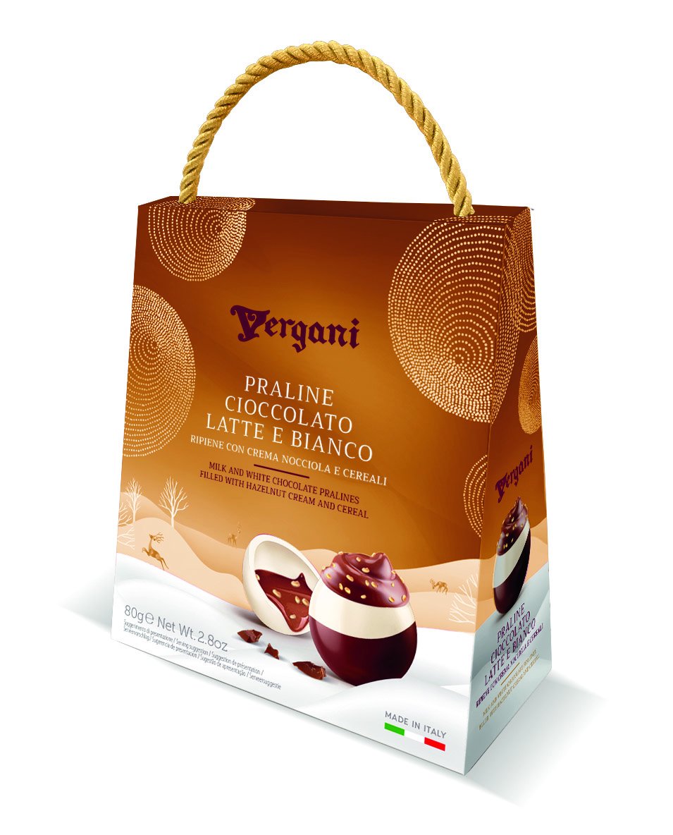 Pralinky z mliečnej a bielej čokolády plnené krémom s príchuťou lieskový oriešok s cereálnym extrudátom. V mliečnej čokoláde: kakaová sušina minimálne 30 %.krém s príchuťou lieskový oriešok s cereálnym extrudátom (55 %): cukor, rastlinné tuky (kokosový, palmojadrový, palmový) v rôznych pomeroch, cereálny extrudát (7 %) (kukuričná múka, ryžová múka, jemne mleté JAČMENNÉ vločky, cukor, JAČMENNÝ sladový extrakt, jedlá soľ), sušená SRVÁTKA, odtučnený kakaový prášok, LIESKOVÉ ORIEŠKY (1 %), emulgátor: SÓJOVÉ lecitíny; arómy; mliečna a biela čokoláda (45 %): cukor, kakaové maslo, sušené plnotučné MLIEKO, kakaová hmota, sušené odstredené MLIEKO, emulgátor: SÓJOVÉ lecitíny, prírodná vanilková aróma. Môže obsahovať iné ORECHY, ARAŠIDY.