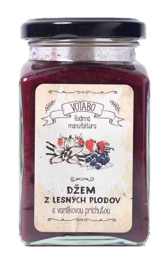 Príjemný sladko-kyslý džem z voňavých lesných plodov s pravou vanilkovou chuťou. Ochutnajte a oddajte sa gurmánskemu zážitku sladkej fantázie. Džem je vyrobený so zníženým obsahom cukru, pripravovaný inovatívnou technológiou, varení krátko, aby nedošlo k znehodnoteniu prospešných látok v ovocí. Vďaka tejto metóde ostane farba svieža a chuť intenzívnejšia. Zloženie: maliny, čučoriedky, ostružiny, ríbezle, cukor, vanilková aróma, citrón, pektín. Neobsahuje konzervačné látky, arómy a farbivá. Použitie: Výborne sa hodí aj na prípravu koláčov, na palacinky, lievance, buchty. Odporúčame vyskúšať aj v kombinácii so zmrzlinou. Okrem toho je skvelý spoločník pri raňajkách, do jogurtu, alebo s croissantom či vianočkou s maslom. Skladujte na chladnom, suchom mieste, po otvorení skladovať v chladničke, spotrebujte do 7 dní.Zloženie: