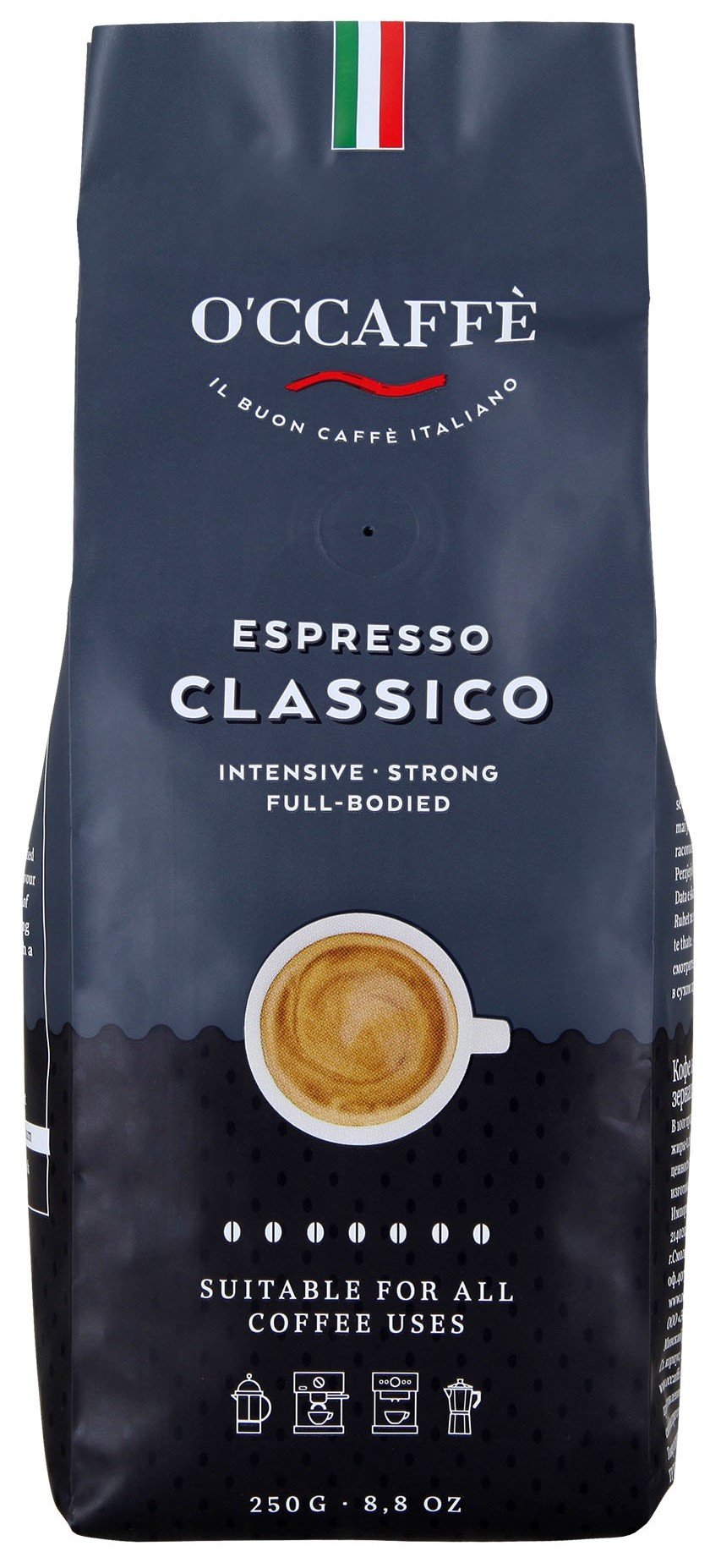 Pražená zrnková káva O’CCAFFÉ Espresso Classico patrí medzi klasické talianske kávy. Spojením zmesi 70% Robusty a 30% Arabiky je spojením prvotriednej odrody kávových zŕn a pražiarenských skúseností rodinného dedičstva. Kombináciou pomeru 70 / 30 vznikla komplexná zrnková káva s vyváženou chuťou zmesí . Základom týchto druhu káv sú dlhoročné priateľské vzťahy s dodávateľmi kvalitnej suroviny v podobe zelených kávových zŕn Robusty a Arabiky pochádzajúcich z Indií a Vietnamu pre odrodu Robusty a Brazílie pre odrodu Arabiky. Výsledkom tajného rodinného receptu praženia tak vzniká Espresso Bar – káva s plným telom, intenzívnou chuťou, jemným náznakom lieskového orecha a dlhotrvajúcou penou. Silná káva so silným charakterom.