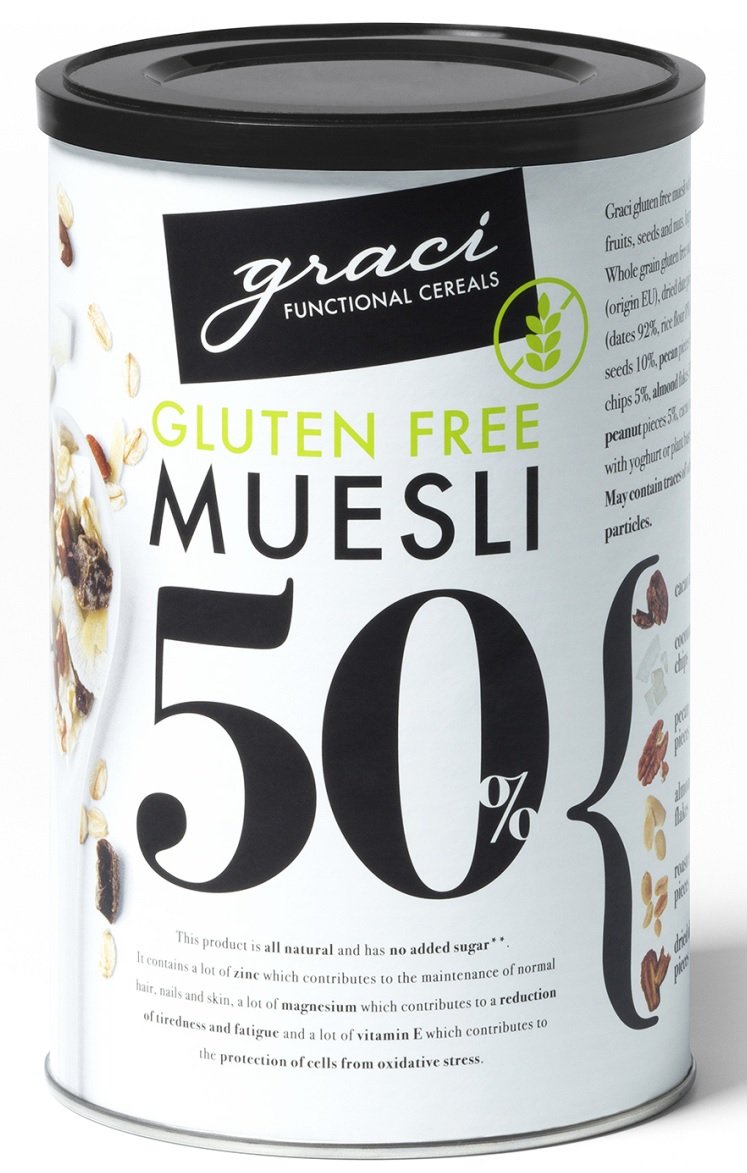 celozrnné ovsené vločky bezgluténové 50%, kúsky sušených datlí 15 % (datle 92 %, ryžová múka 8 %), slnečnicové semienka 10 %, kúsky pekanových ORECHOV 8 %, kokosové lupienky 5 %, MANDĽOVÉ lupienky 5 %, kúsky pražených ARAŠIDOV 5 %, kakaové bôby 2 %. Môže obsahovať iné ORECHY. Konzumujte s jogurtom alebo rastlinnými alternatívami.