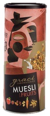 Graci Fruts muesli. Zmes s pečenými celozrnnými vločkami a celozrnnými tritikale pšenično-ražnými vločkami, so sušeným ovocím. Krajina pôvodu: Lotyšsko. Krajina pôvodu celozrnných vločiek: EÚ.