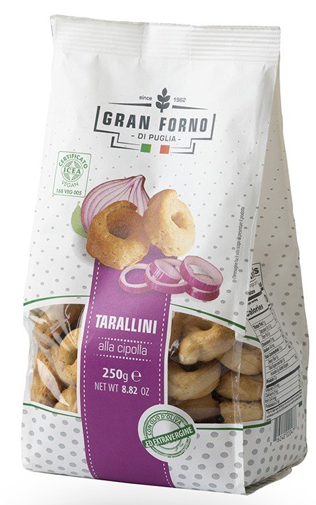Chrumkavý pekársky výrobok s príchuťou cibule. S extra panenským olivovým olejom 5%. Zloženie: PŠENIČNÁ MÚKA z tvrdej pšenice (semolina)*, biele víno (obsahuje SIRIČITANY), olivový olej 15%, extra panenský olivový olej 5%, soľ, sušená cibuľa 1%. Môže obsahovať SEZAMOVÉ SEMENÁ,SÓJU, HORČICU, a VLČÍ BÔB. *Pšeničná múka pochádza z EÚ. Krajina pôvodu: TalianskoZloženie: