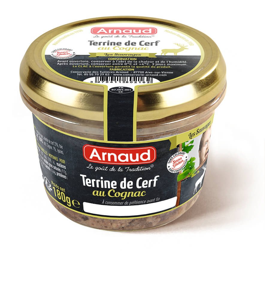 Terina z diviny (jeleňa) s Cognacom - mäsová nátierka Zloženie: bravčové mäso, mäso z jeleňa 21%, hydinová pečeň, vajcia , jedlá soľ, Cognac 1%, korenie, prírodná aróma, mlieko. Bez farbív a konzervačných látok. Čistá hmotnosť: 180 g. Skladujte v suchu. Výživové údaje v 100g výrobku: Energia 1173 kJ/283 kcal; tuky:25 g z toho nasýtené mastné kyseliny 9,4 g; sacharidy: 0,6 g z toho cukry: 0,5 g, bielkoviny:14 g, soľ: 1,5 gZloženie: