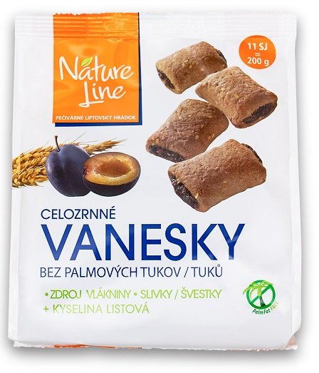 Celozrnné sušienky so slivkami. Zloženie: pšeničná múka, fruktóza 21 %, sušené slivky 19 % (sušené slivky, konzervačná látka /sorban draselný/), margarín (repkový olej, kokosový tuk, úplne hydrogenovaný repkový olej, emulgátor /mono- a diglyceridy mastných kyselín/, regulátor kyslosti /kyselina citrónová/, aróma, vitamín A), pšeničná múka celozrnná 10 %, kakaová poleva s fruktózou (rastlinný tuk úplne hydrogenovaný /kokosový, repkový/, sušená srvátka, odtučnené kakao 14 %, fruktóza 14 %, laktóza, maltodextrín, rastlinný tuk maslovníkový, emulgátor /lecitín/, arómy), semená sezamu, odtučnené kakao, regulátor kyslosti (kyselina jablčná), sušený vaječný žĺtok, kypriace látky (uhličitany sodné a amónne), arómy, kyselina listová. Alergény: pšeničná múka, sušená srvátka, laktóza, semená sezamu, vaječný žĺtokpšeničná múka, fruktóza 21 %, sušené slivky 19 % (sušené slivky, konzervačná látka /sorban draselný/), margarín (repkový olej, kokosový tuk, úplne hydrogenovaný repkový olej, emulgátor /mono- a diglyceridy mastných kyselín/, regulátor kyslosti /kyselina citrónová/, aróma, vitamín A), pšeničná múka celozrnná 10 %, kakaová poleva s fruktózou (rastlinný tuk úplne hydrogenovaný /kokosový, repkový/, sušená srvátka, odtučnené kakao 14 %, fruktóza 14 %, laktóza, maltodextrín, rastlinný tuk maslovníkový, emulgátor /lecitín/, arómy), semená sezamu, odtučnené kakao, regulátor kyslosti (kyselina jablčná), sušený vaječný žĺtok, kypriace látky (uhličitany sodné a amónne), arómy, kyselina listová. Alergény: pšeničná múka, sušená srvátka, laktóza, semená sezamu, vaječný žĺtok